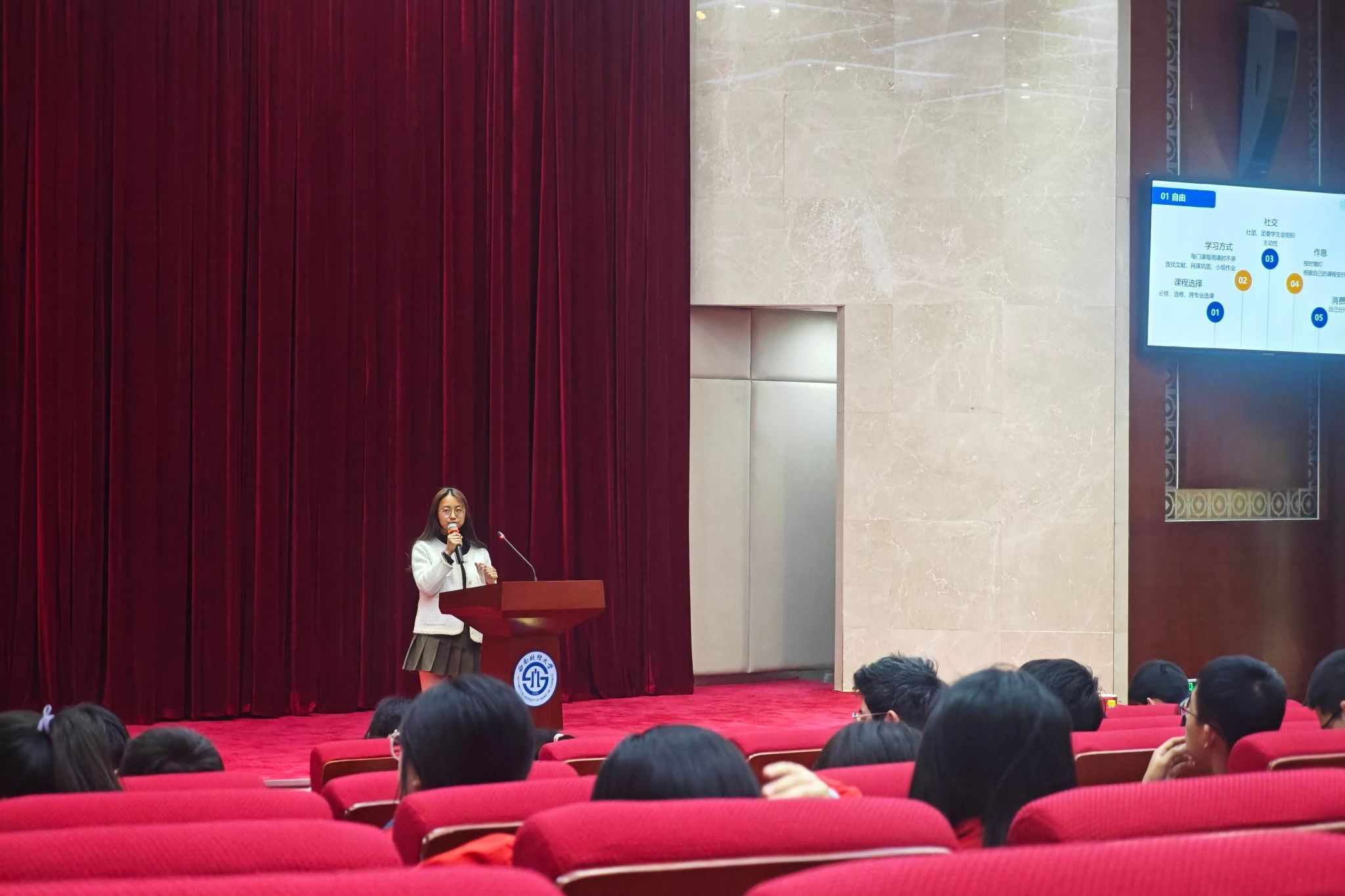 随后的朋辈分享环节中,树德的校友同时也是学院2024级工商管理类(会计学院)专业的陈鑫悦同学结合自身经历,分享了高效学习方法;2024级工商管理类(会计学院)专业柳思偲则展示了校园生活、食堂美食、社团活动等细节引发阵阵掌声。