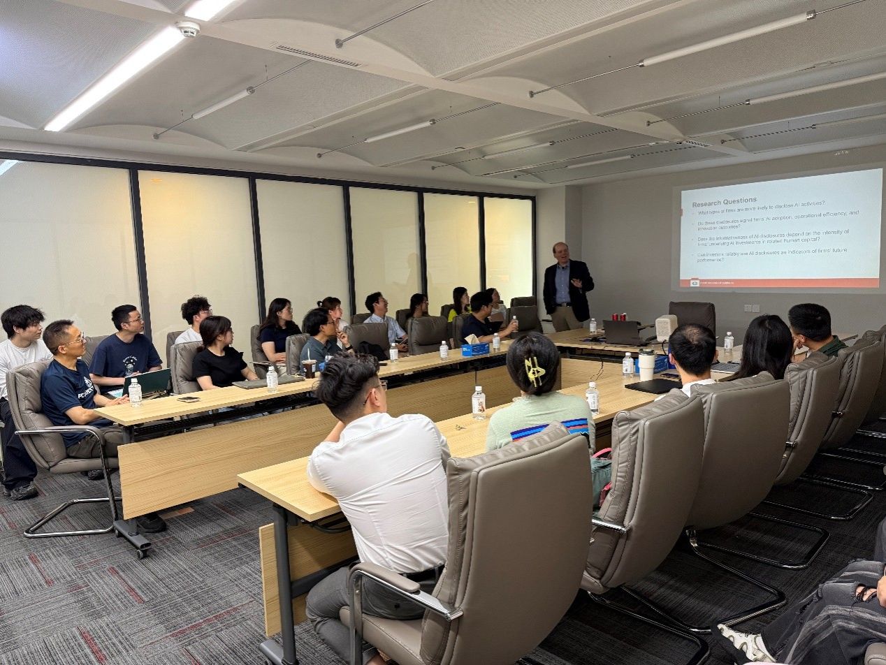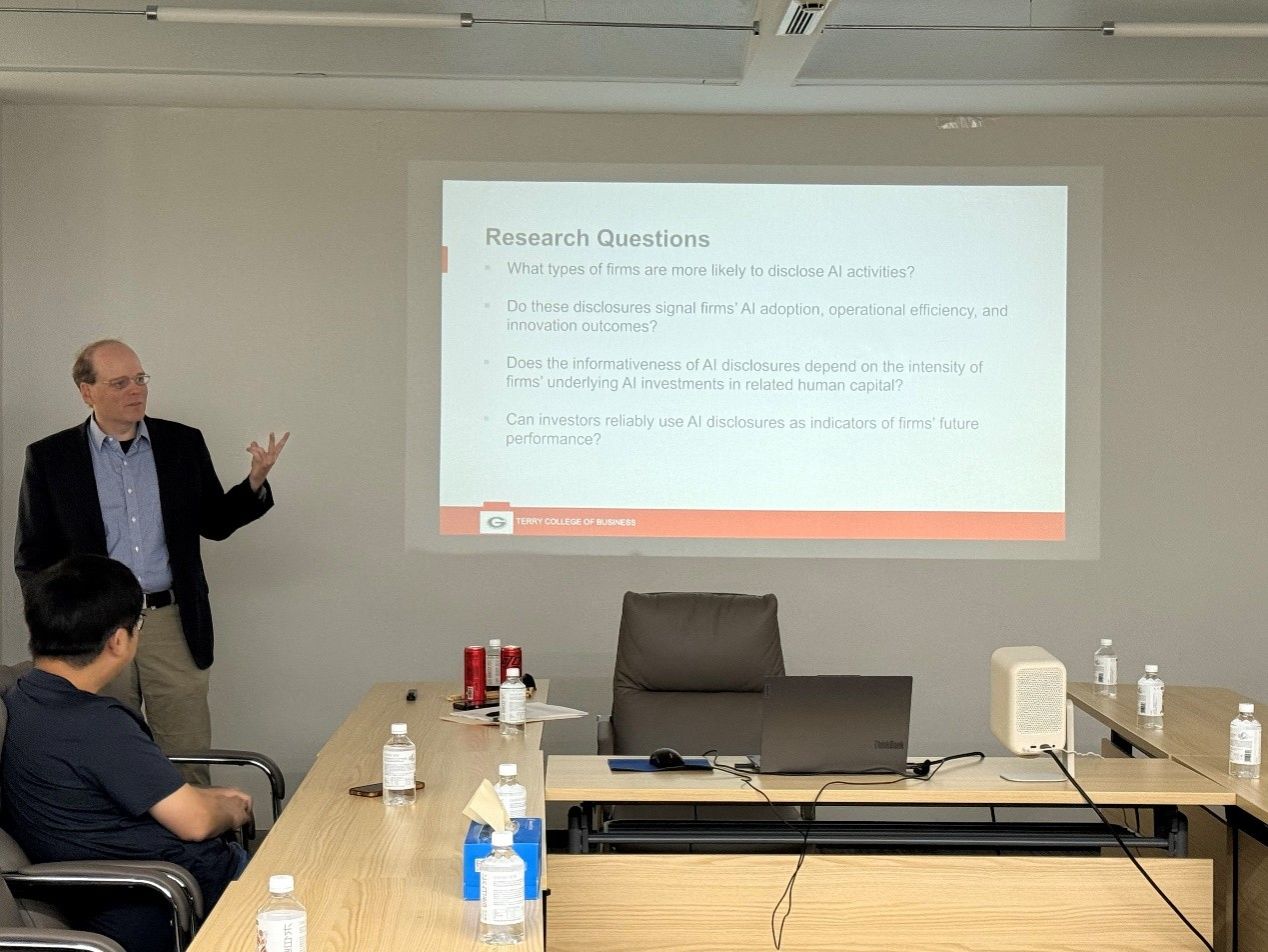 6月19日上午,Campbell教授在诚正楼544会议室举办了主题为“信号还是烟雾?企业人工智能披露的决定因素与信息含量”的专题讲座。讲座由高升好教授主持。Campbell教授深入阐释了企业AI信息披露的驱动机制及其对投资者决策的信息价值,指出人工智能信息披露能够为市场提供关于企业技术投入与信心的有效信号。交流活动气氛融洽,与会师生围绕人工智能信息披露及人工智能在会计研究中的应用与Campbell教授展开了深入对话。下午,Campbell教授还与我院部分教师开展了一对一交流,对教师们的工作论文、在研项目和未来研究提供了建设性意见和建议。(图文/张齐 初审/罗瀚林 复审/曾媛媛 终审/易阳)