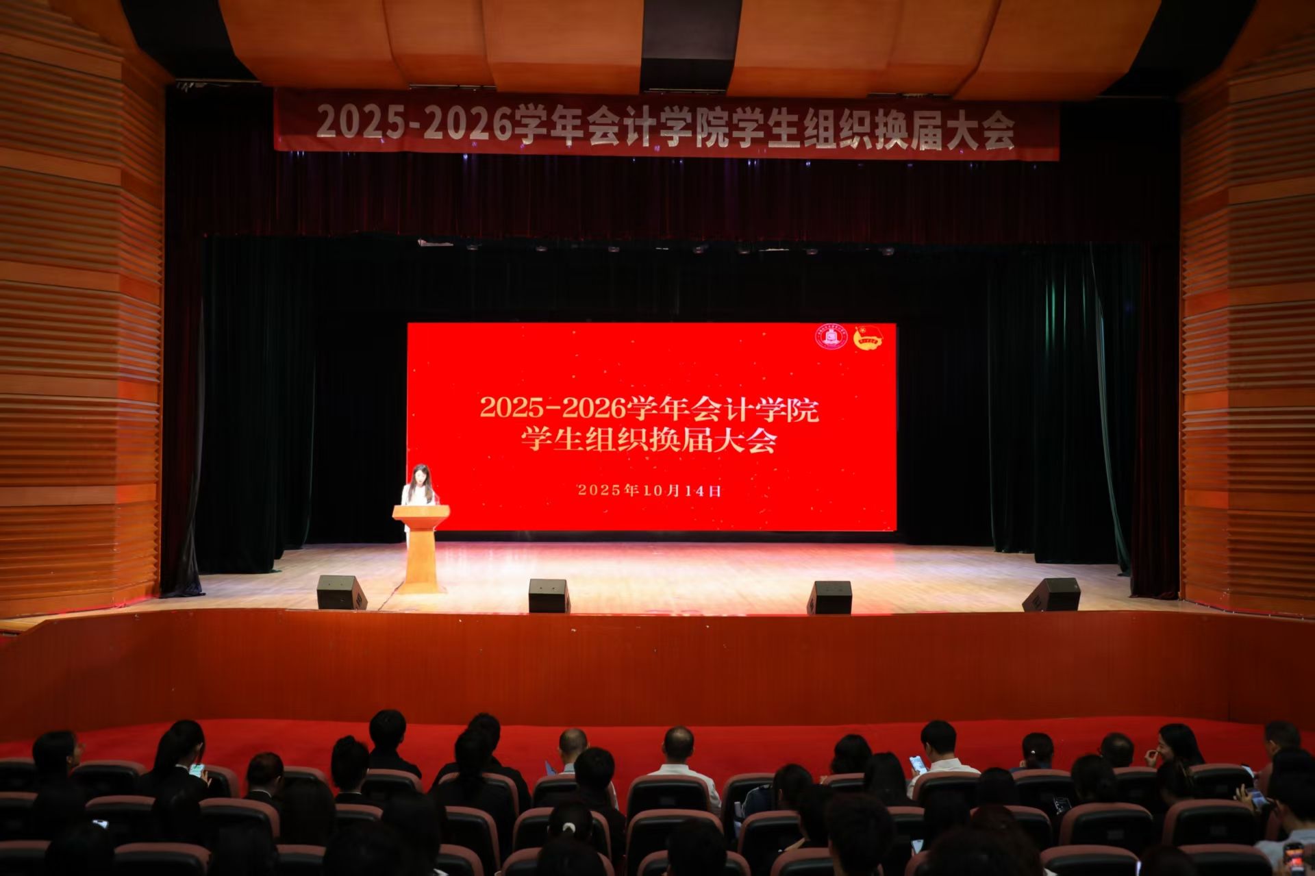 10月14日下午,2025-2026学年会计学院学生组织换届大会在学生活动中心八百人厅顺利举行。会计学院党委书记刘晓彬、党委副书记张太富以及学院各学生组织的指导老师和全体同学参加了本次大会。大会由会计学院团委书记王慧主持。