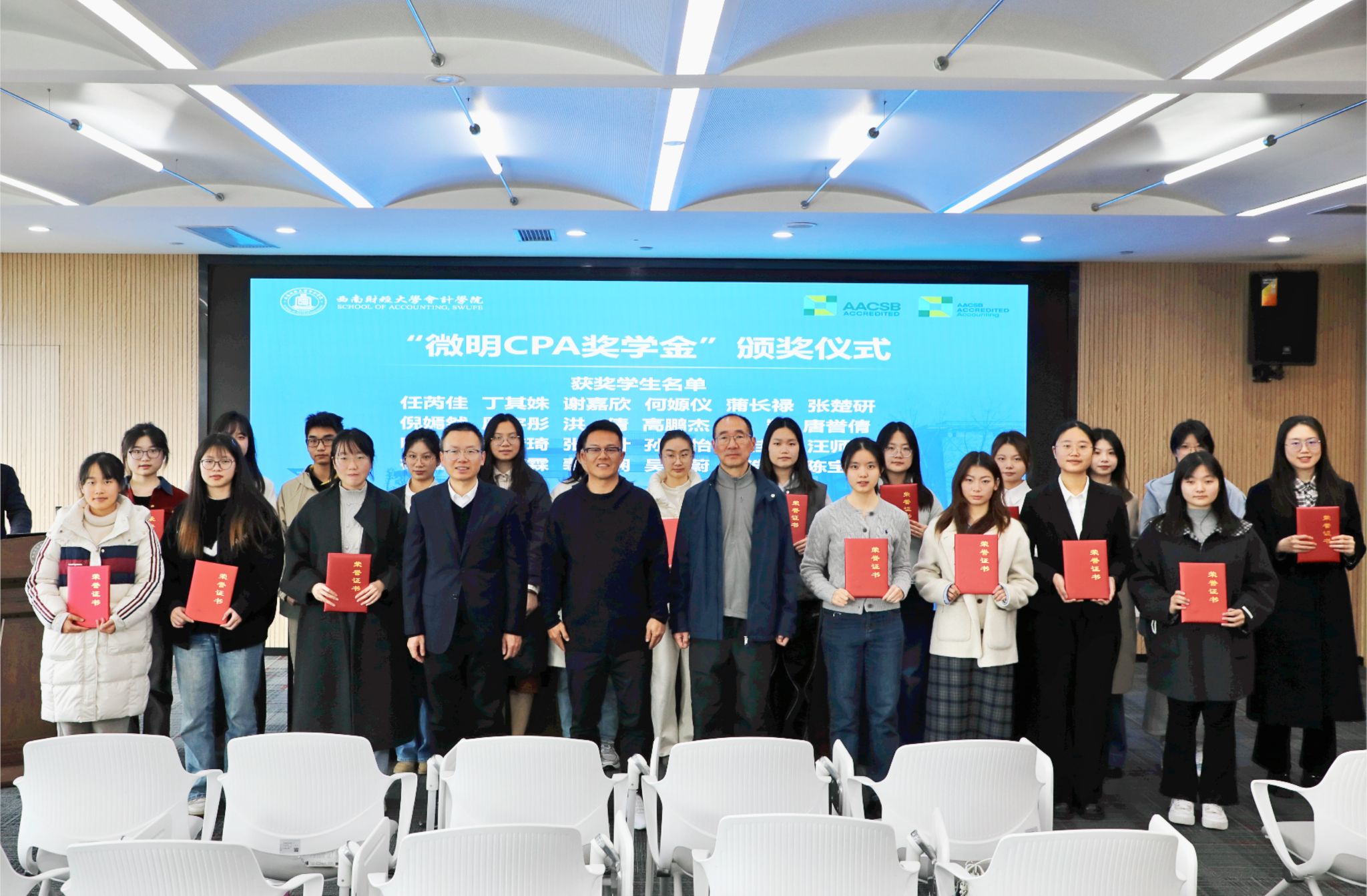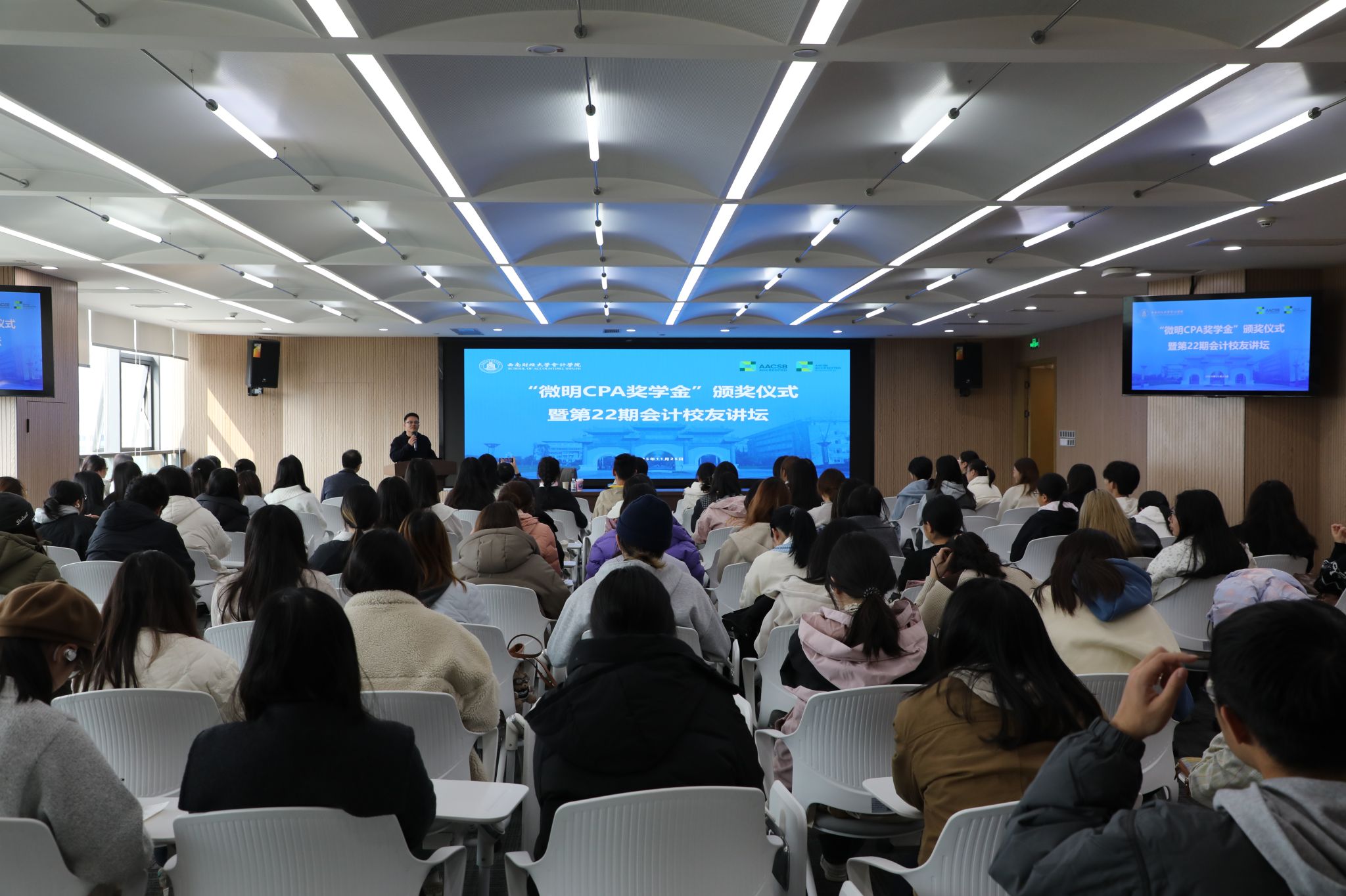 11月25日下午,会计学院微明CPA奖学金颁奖仪式暨第二十二期会计校友讲坛在诚正楼720会议室隆重举行。微明校友、会计学院院长唐雪松、党委书记刘晓彬、党委副书记杨长虹及全体获奖学生、各年级CPA专业同学约100人共同参与活动。