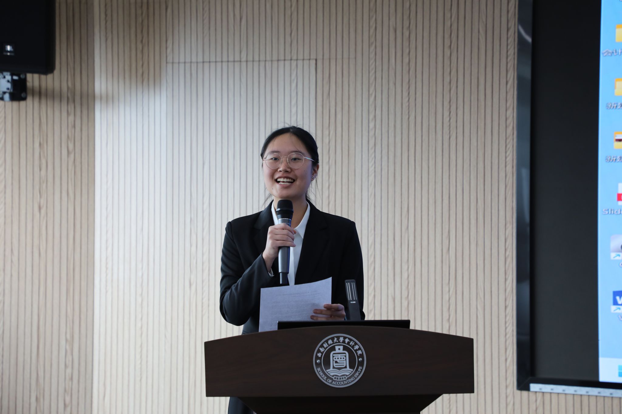 颁奖仪式环节,微明校友、唐雪松院长和刘晓彬书记共同为获得“微明CPA奖学金”的同学颁发了获奖证书。来自2024级CPA专业谢嘉欣同学作为获奖学生代表发言。
