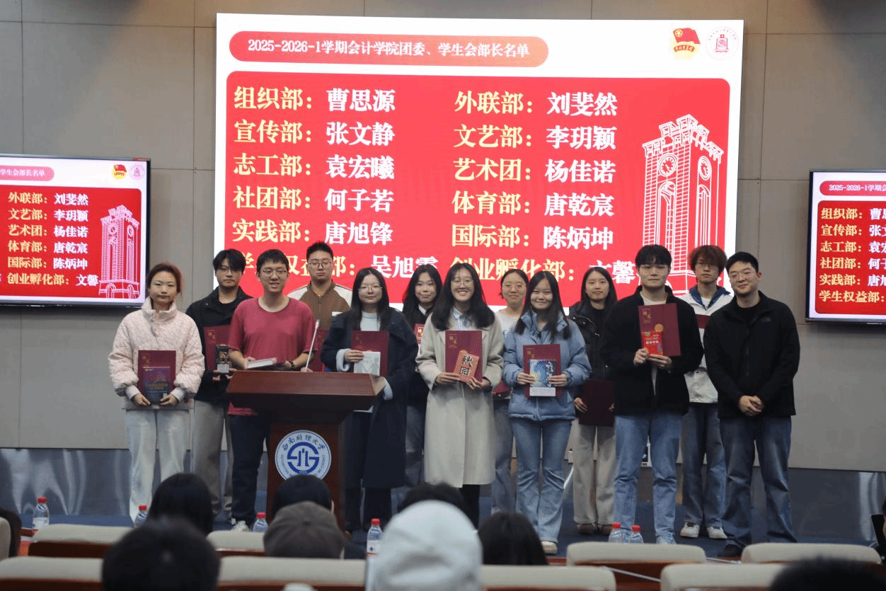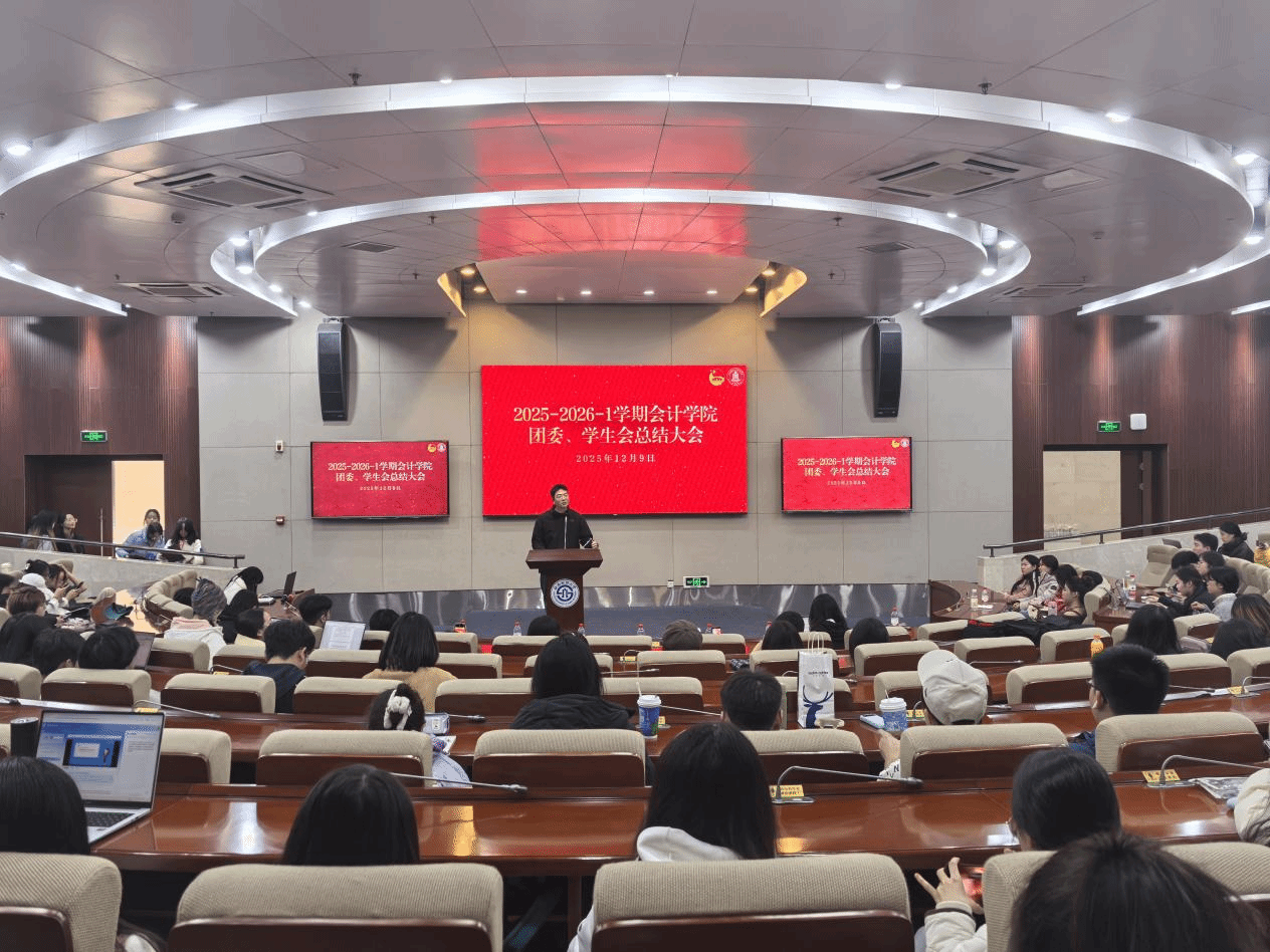 12月9日下午,2025-2026学年第一学期会计学院团委、学生会总结大会在弘远楼101顺利举行。团委、学生会指导老师王慧、张博涵出席本次会议,会计学院团委、学生会全体成员参加本次会议,团委、学生会指导老师杨凌峰主持会议。