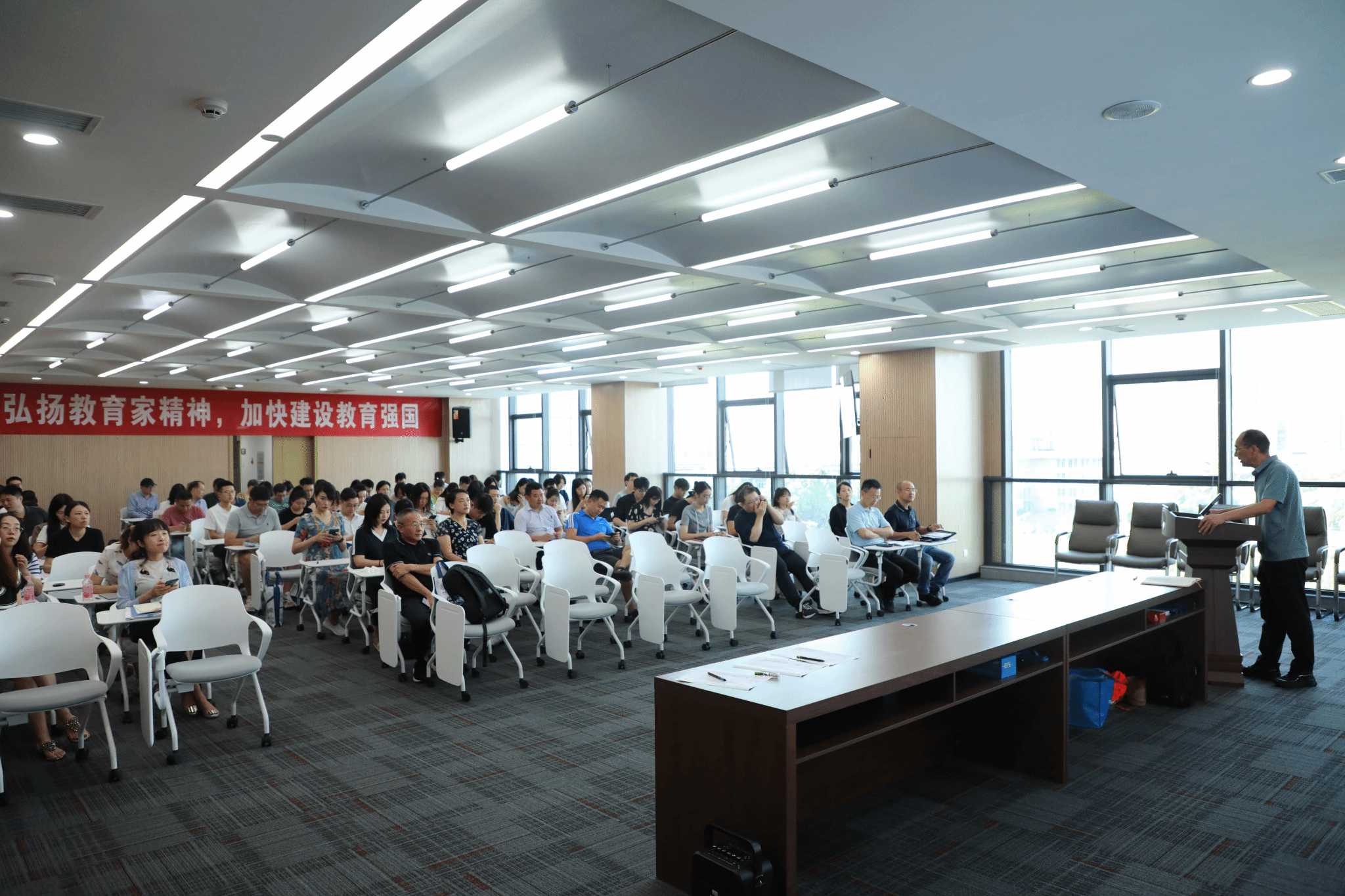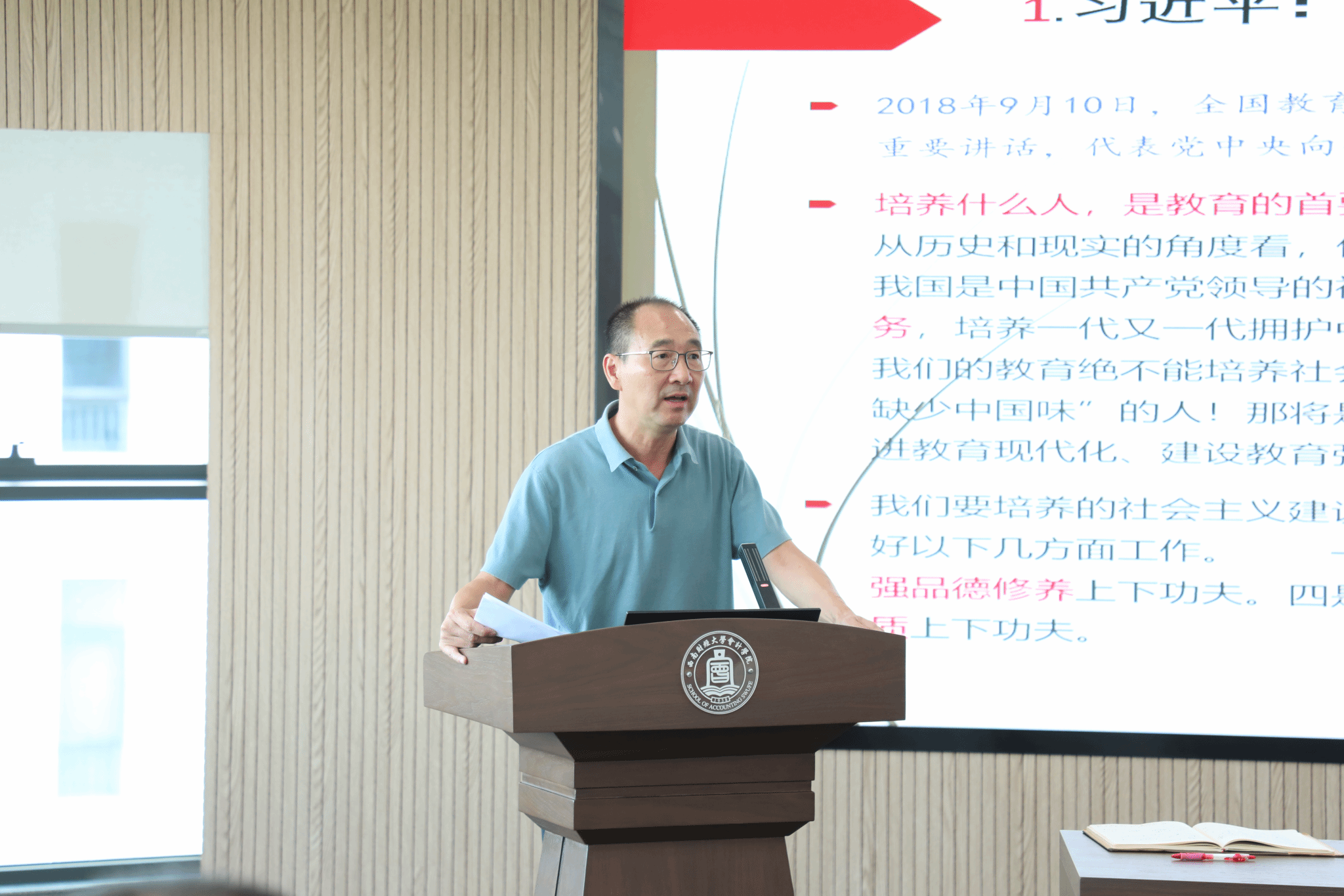 刘晓彬导学了《中共中央 国务院关于弘扬教育家精神加强新时代高素质专业化教师队伍建设的意见》,阐述了教育家精神的核心要义和精神实质。他强调,全体教师要将党的二十届三中全会精神、教育家精神与教书育人工作职责相结合,不断提高自身的教育教学水平,不断提高思想政治素质,把教育家精神融入到日常教学和管理工作中,将“师德师风建设月”活动与庆祝第40个教师节活动、迎接百年校庆活动、巩固拓展党纪学习教育成果等相结合,在学院组织开展内容丰富、形式多样的师德教育活动。