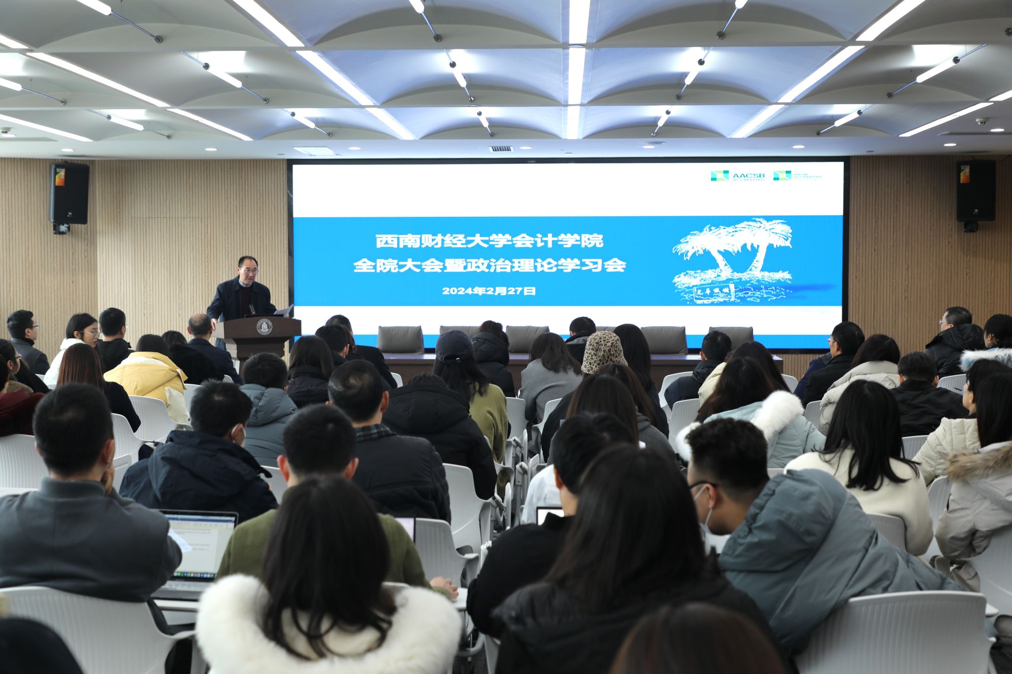 新岁序开,共赴新程。2月27日下午,会计学院在诚正楼720会议室召开政治理论学习会暨新学期开学工作部署会,集中学习习近平总书记关于金融强国建设、教育强国建设的系列重要讲话精神,深入学习贯彻习近平总书记在中央金融工作会议和省部级主要领导干部推动金融高质量发展专题研讨班开班式上的重要讲话精神,传达学习学校2024年春季学期中层干部学习会精神,安排部署新学期各项工作。全院教职工参加会议,学院党委书记刘晓彬主持会议。