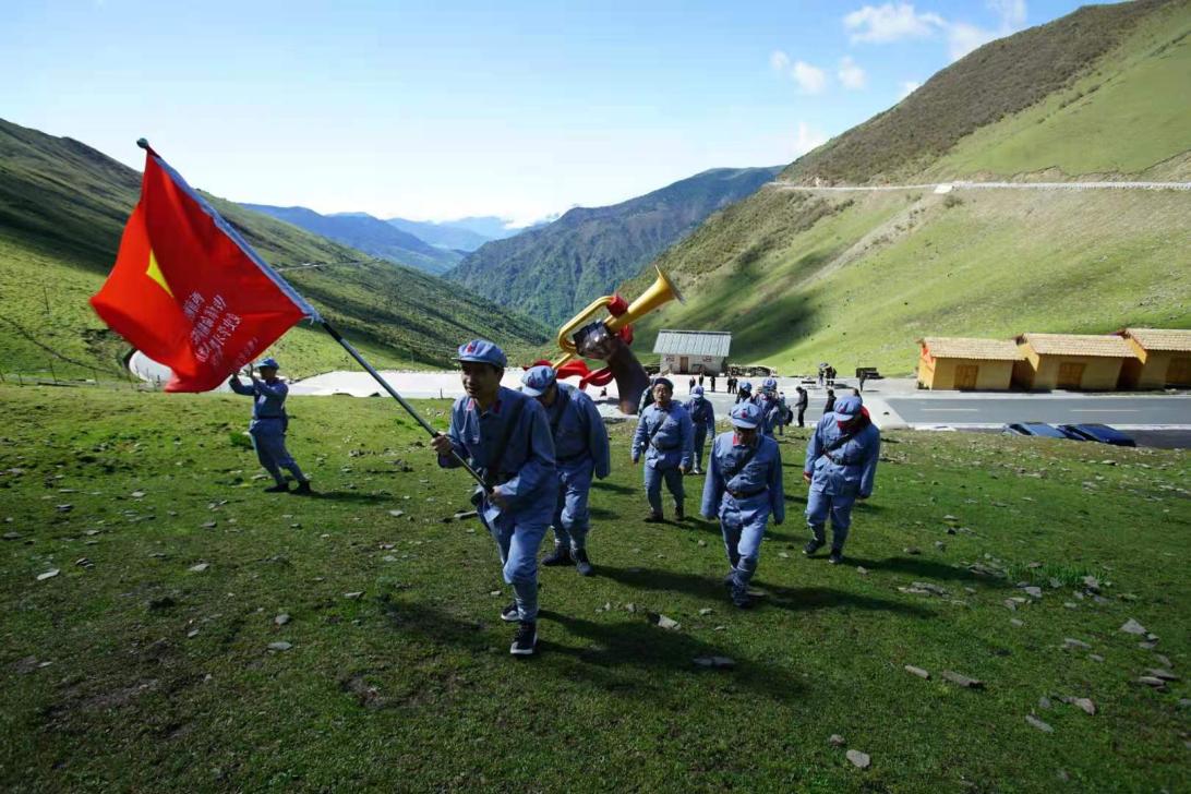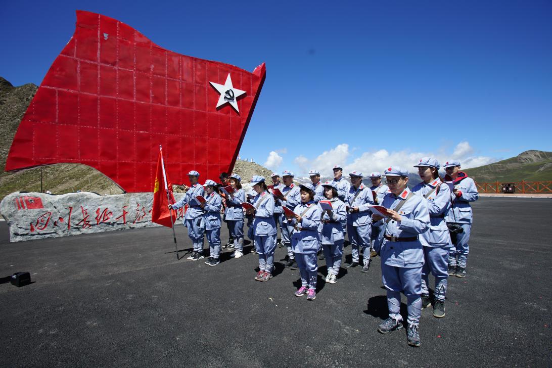 高擎党旗,学员们从五道拐前徒步,沿着昔日红军足迹,向海拔3650米的目的地行进。顶着高原烈日,克服高原反应,困难的呼吸,灌铅的脚步,每一个迈出的沉重步伐,都深切感受到伟大的革命先烈们在艰苦千万倍的条件下迈向革命成功的蹈峰饮血、殒身不恤的大无畏精神。在行进途中,大家努力克服高海拔带来的身体不适,一步一个脚印,最终抵达指定地点。