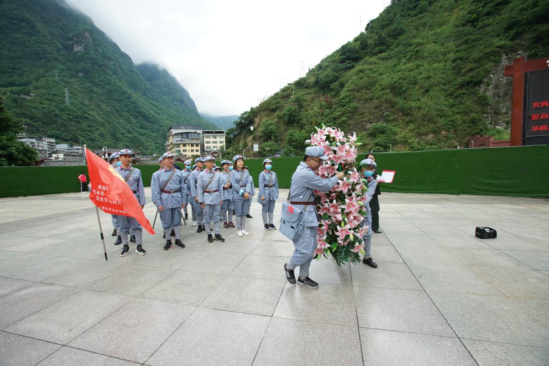 在红军长征翻越夹金山纪念馆广场,现场庄严肃穆,全体学员整齐列队,大家面向纪念碑默哀,表达对革命烈士最崇高的敬意。学员代表向纪念碑敬献花篮,学院分党委书记刘晓彬仔细整理花篮缎带,并带领全体学员重温入党誓词。