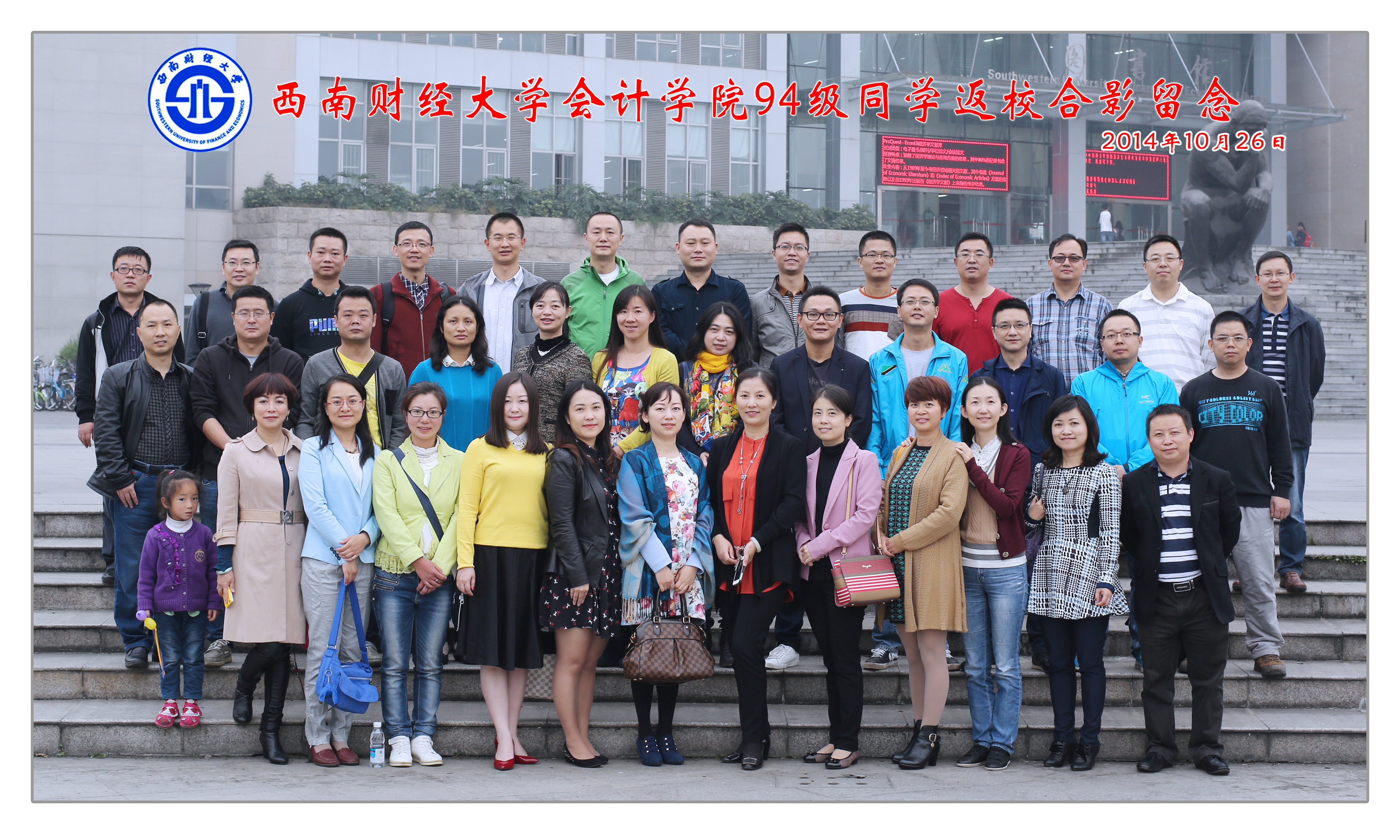 10月24日至26日,我校会计九四级本科诸位同学从全国各地奔赴成都,举行入校二十周年聚会。时任法学院分党委书记的余莉老师、会计学院分党委副书记的方萍老师应邀出席,并真情寄语各位同学,欢迎各位同学来到母校。二十年前,这些目前已经在各行各业发挥骨干作用的同学从五湖四海集中到yl1111永利集团报道,开始大学四年的生活,也开启了人生新的旅程。