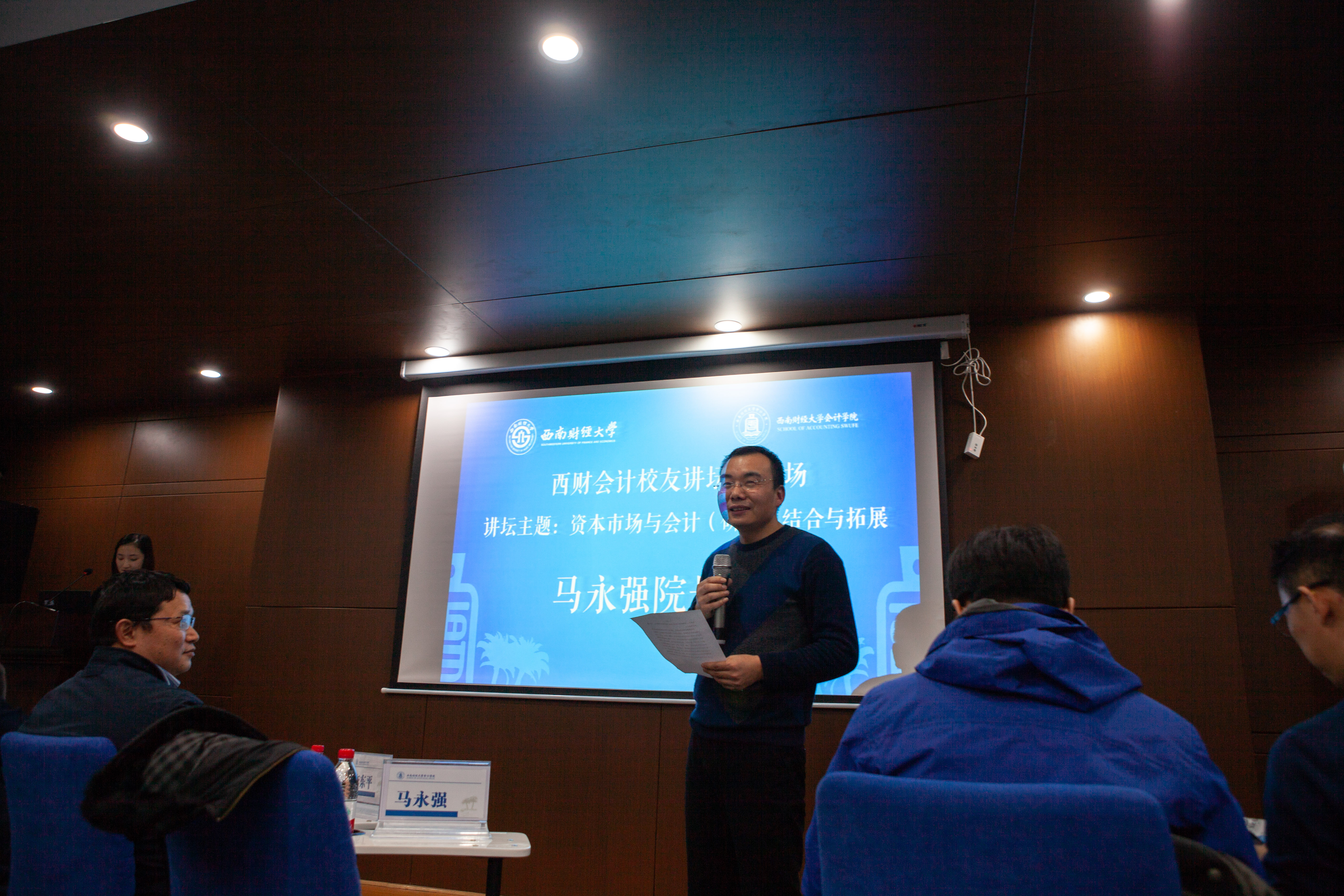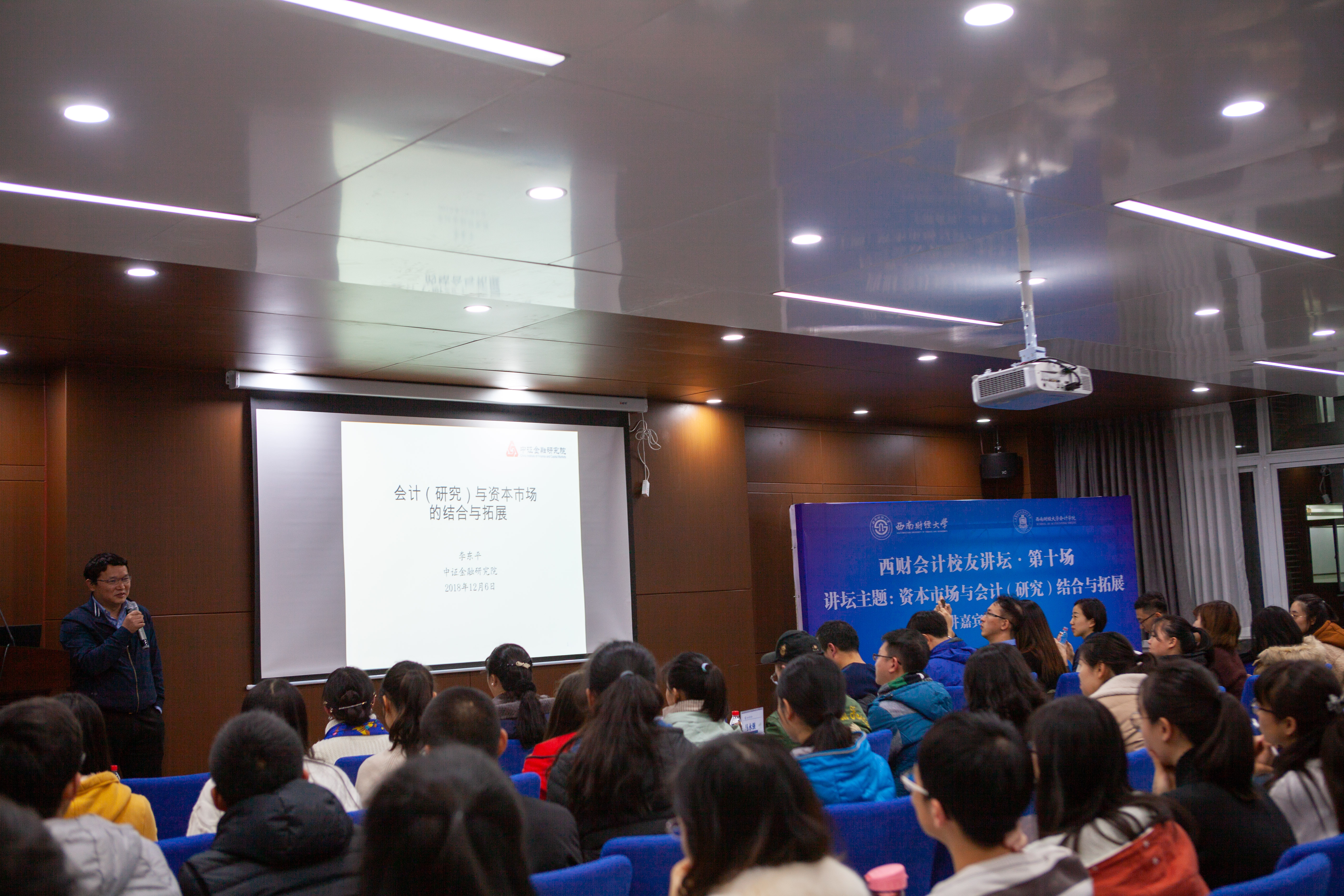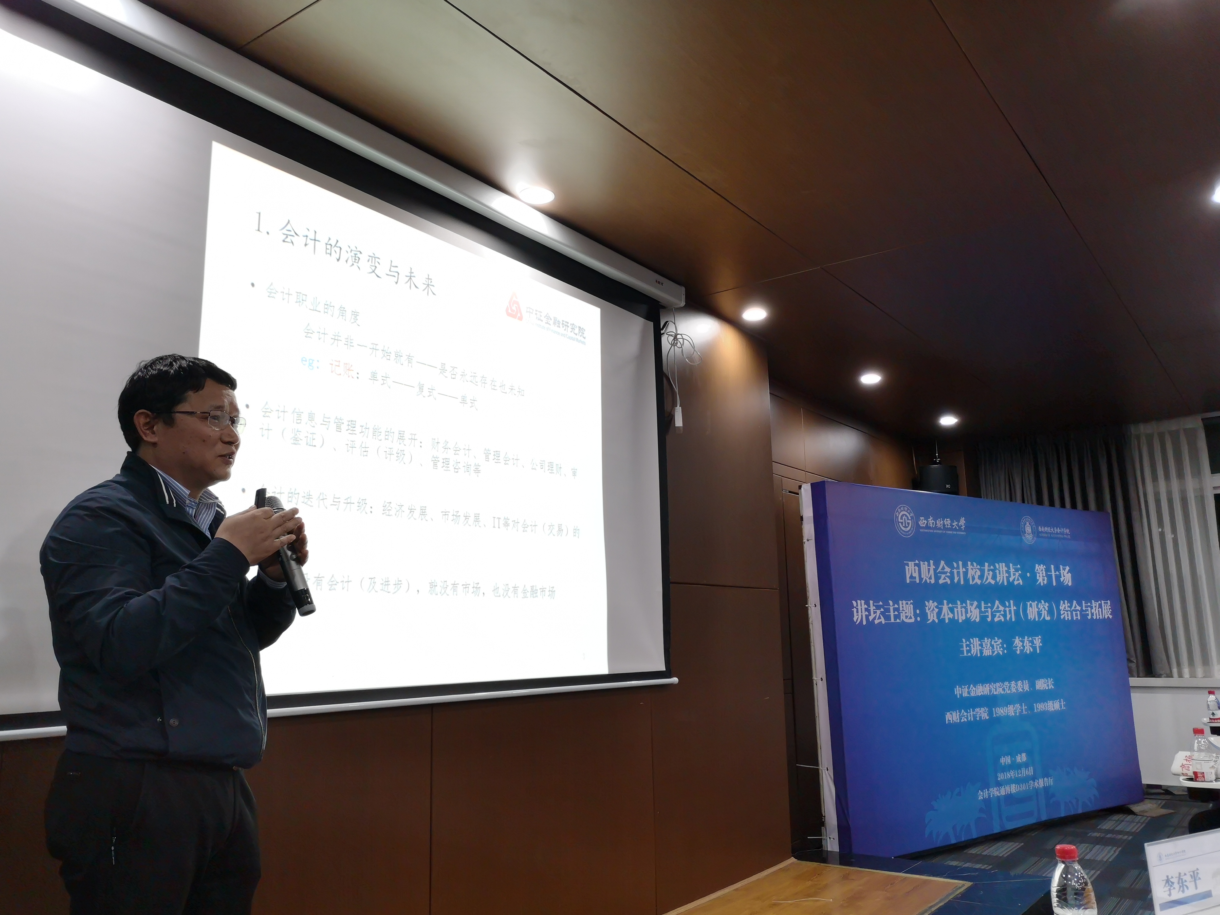 12月6日晚19:00,第十场“西财会计校友讲坛”于yl1111永利集团柳林校区通博楼D301学术报告厅拉开帷幕。我校会计学院1989级审计专业学士 、1993级会计专业硕士,现担任中证金融研究院党委委员、副院长的李东平先生应邀担任此次讲坛的主讲嘉宾。yl1111永利集团会计学院院长马永强、分党委副书记方萍、院务助理兼校友与外联办公室主任吴颖洁与100余名会计学院的博士、科学学位硕士和本科科研兴趣小组的同学们一起参与了讲坛活动。 讲坛伊始,马永强院长致辞,对李东平校友做了介绍,并代表学院感谢李东平校友长期以来心怀母校,对西财会计学科的建设和科研工作一直给予了深切关心和热心支持。