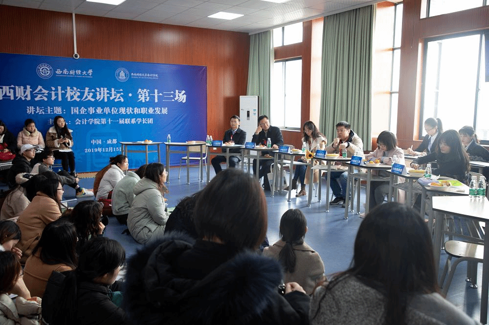 随着第一批同学的到达落座,现场面对面问答交流环节也正式拉开了序幕。四川金宇汽车城股份有限公司财务总监赵文燕学长,四川省地矿局测绘队财务部副主任赖珊珊学姐,四川省交通勘察设计研究院有限公司财务部副经理梁波学长,中国信达资产管理股份有限公司四川省分公司项目经理陈浩学长,成都燃气集团股份有限公司会计康艺馨学姐,中国长城资产管理股份有限公司四川省分公司员工朱叶学姐对同学们的问题耐心地进行了解答。