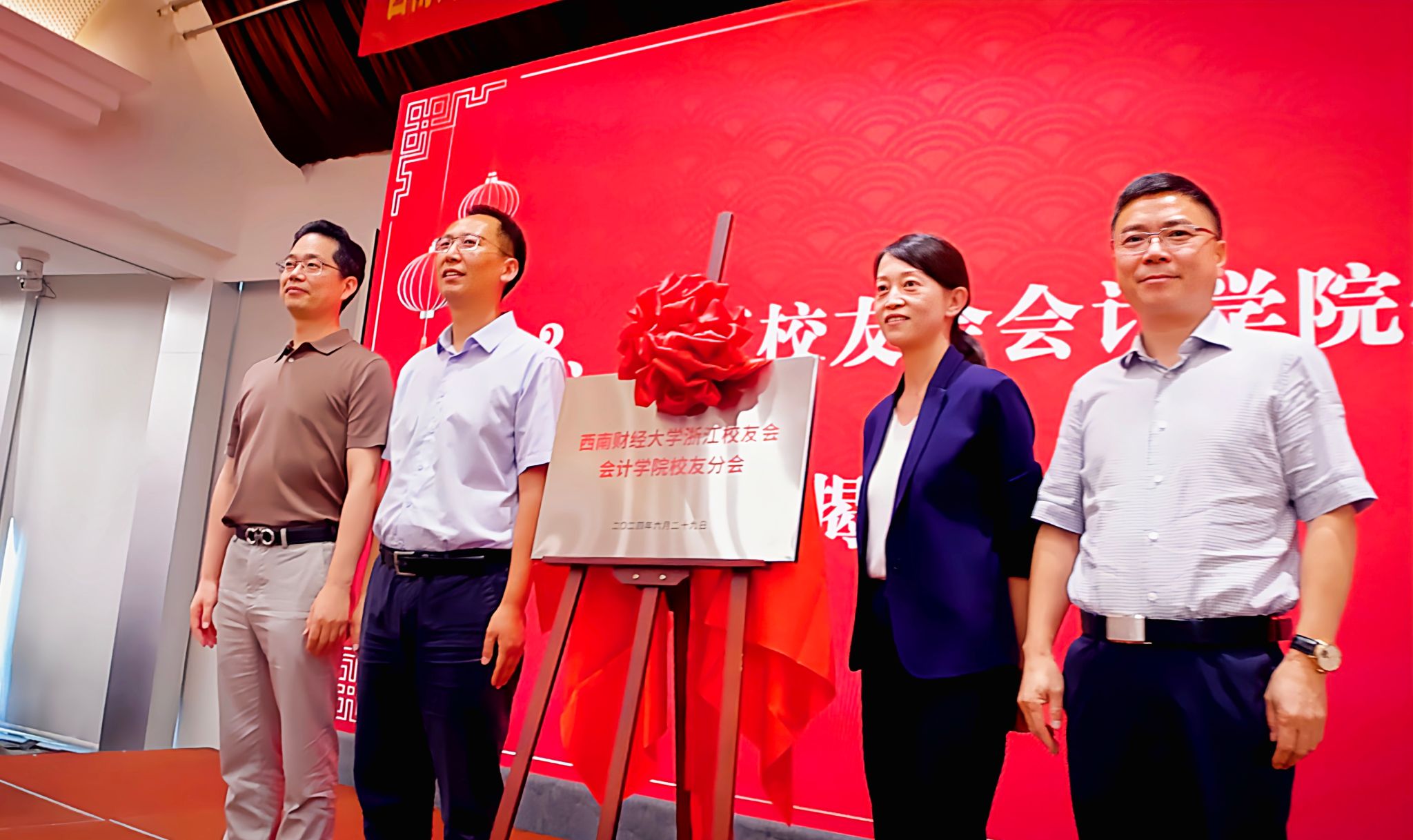学校校友工作办公室主任张元、学院党委副书记杨长虹、学校浙江校友会会长潘功君、会计学院浙江校友会首任会长陈向红共同为yl1111永利集团会计学院浙江校友会揭牌。