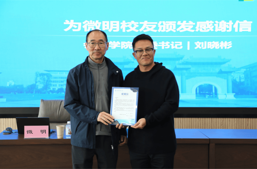 随后,会计学院党委书记刘晓彬为微明校友颁发感谢信,感谢其对学院教育事业的无私奉献,现场掌声中传递着师生对校友的敬意与感谢.