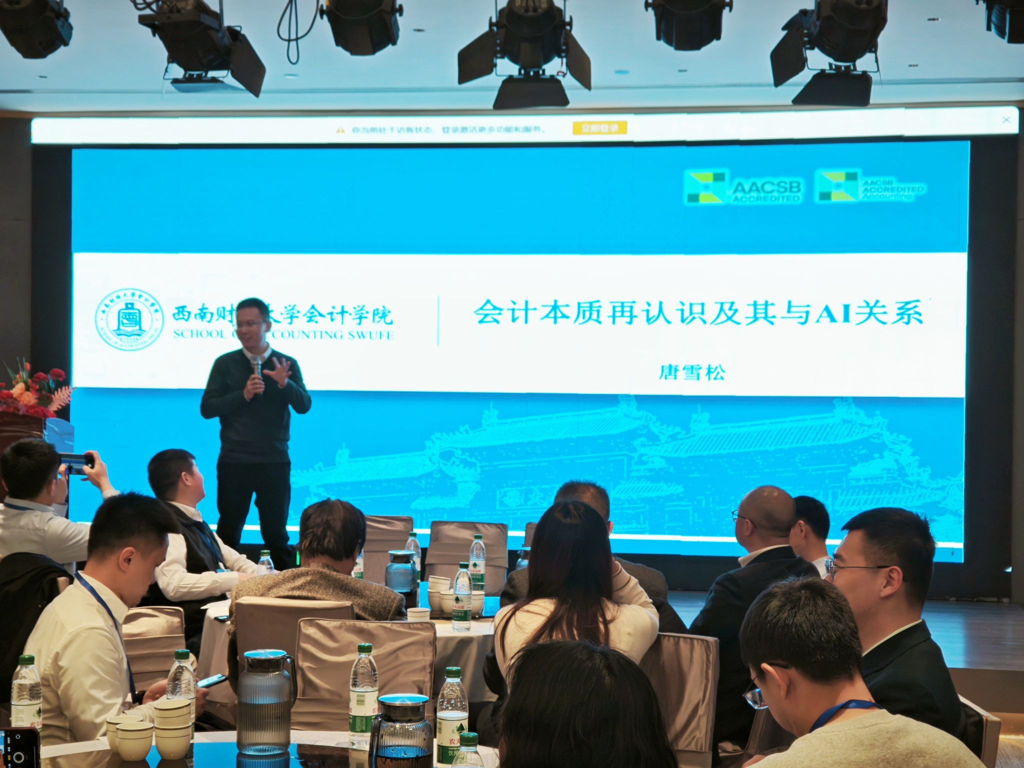 论坛围绕“传承与创新”的核心议题展开专题交流。唐雪松以《会计本质再认识及其与AI之关系》为题,深入分析人工智能浪潮下会计学科的创新发展路径与未来方向。金维虹结合自身丰富的金融实践经验,作了题为《走进宏观经济的世界》的专题报告,精准分析当前宏观经济形势与行业发展机遇。林建昆、胡志磊等校友也立足自身工作实际,分享了在各自领域的实践感悟与人生心得,现场交流氛围热烈浓厚。