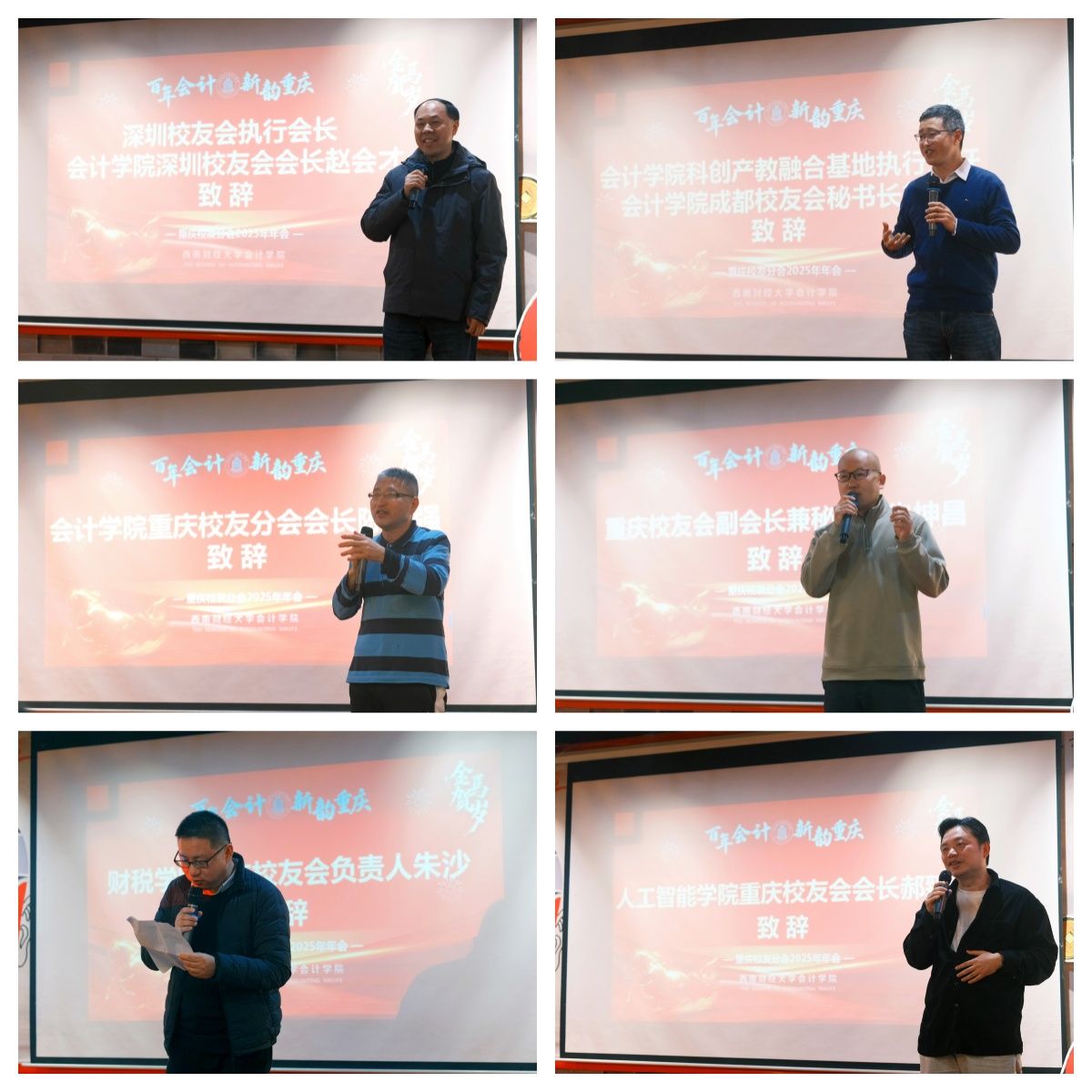 随后,会计学院深圳校友会代表赵会才、成都校友会秘书长鲁品,会计学院重庆校友会会长陈德强、重庆校友会副会长兼秘书长朱坤昌、兄弟学院重庆校友会代表朱沙、郝臻科,先后登台致辞。大家不仅送上了对会计学院重庆校友会首届年会举办的热烈祝贺,更表达了对跨区域校友资源共享、联动发展的热切期盼。