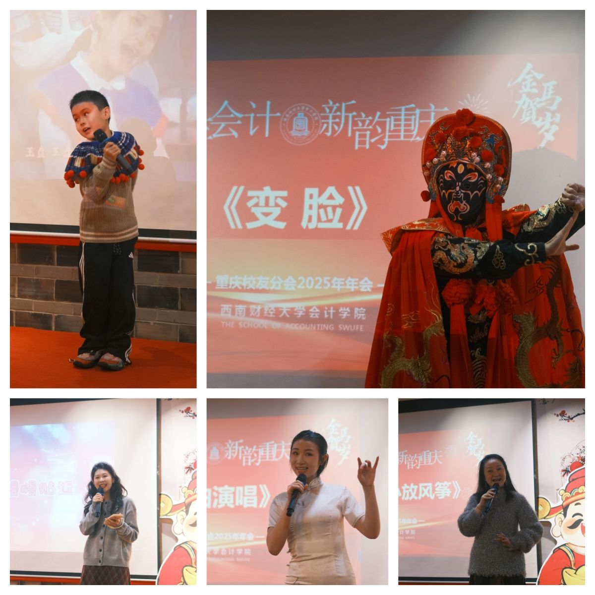 文艺表演环节精彩纷呈,为现场增添了满满温情与欢乐氛围。由专业演员和校友家属共同演绎的四川戏曲、四川清音、川剧变脸、歌曲演唱等特色节目,赢得现场阵阵掌声与喝彩,将年会氛围一次次推向高潮。