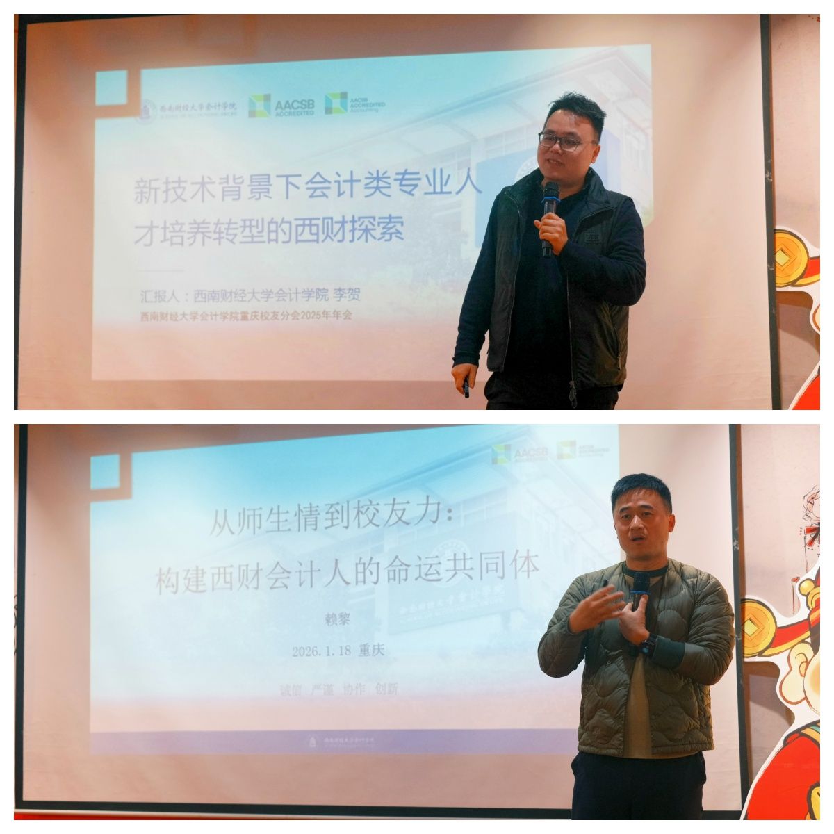 学术分享环节,会计学院李贺教授带来《新技术背景下会计类专业人才培养转型的西财探索》分享,深入剖析行业变革下人才培养的新路径;赖黎教授则以《从师生情到校友力:构建西财会计人的命运共同体》为题,阐释了校友情谊的深厚内涵与聚合力量,为校友联动发展提供了新思路、新方向。