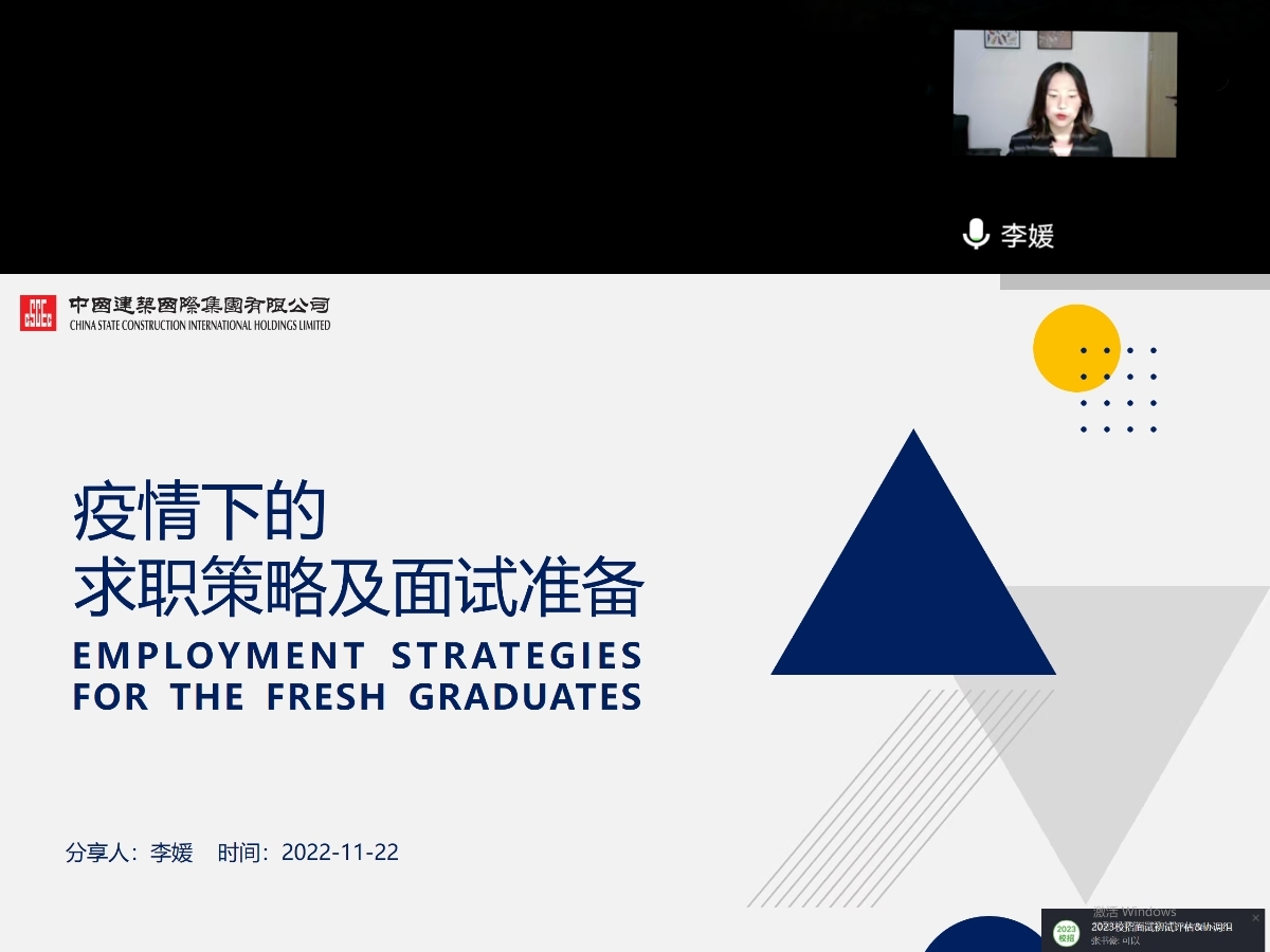 为提升学生的就业能力和面试技巧,11月22日下午两点,由会计学院学生成长与发展中心组织举办的面试辅导活动在线上顺利进行。本次活动邀请了中国建筑国际集团有限公司四川公司的高级人力资源主管李媛分享求职策略和面试准备。