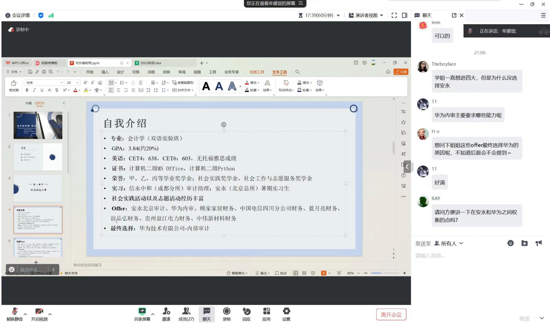 分享会上,2023届本科毕业生牟媛显围绕工作体验,秋招经验,个人建议进行分享交流。牟媛显向学弟学妹们分享入职华为技术公司的初体验,谈到了公司文化、工作环境、工作内容以及面对的挑战和应对策略。牟媛显结合自身秋招经验,从简历制作、面试技巧、职业规划等方面为大家传授经验,她提出简历应内容精简,重点突出,结构明晰,面试时自信大方,主动与参加面试的其他同学交流,信息共享,避免内耗,还分享了通过制作Excel表格记录秋招进度的方法。牟媛显建议大家根据自身情况选择适合自己的道路,考研、考公、出国、参加秋招,当选择不唯一时,应确定主航道,调整好心态,不打断自己的计划。在答疑交流环节,牟媛显鼓励学弟学妹在校期间打好专业知识基础,并对学弟学妹提出的面试技巧、实习、外派等方面的问题耐心答疑解惑。