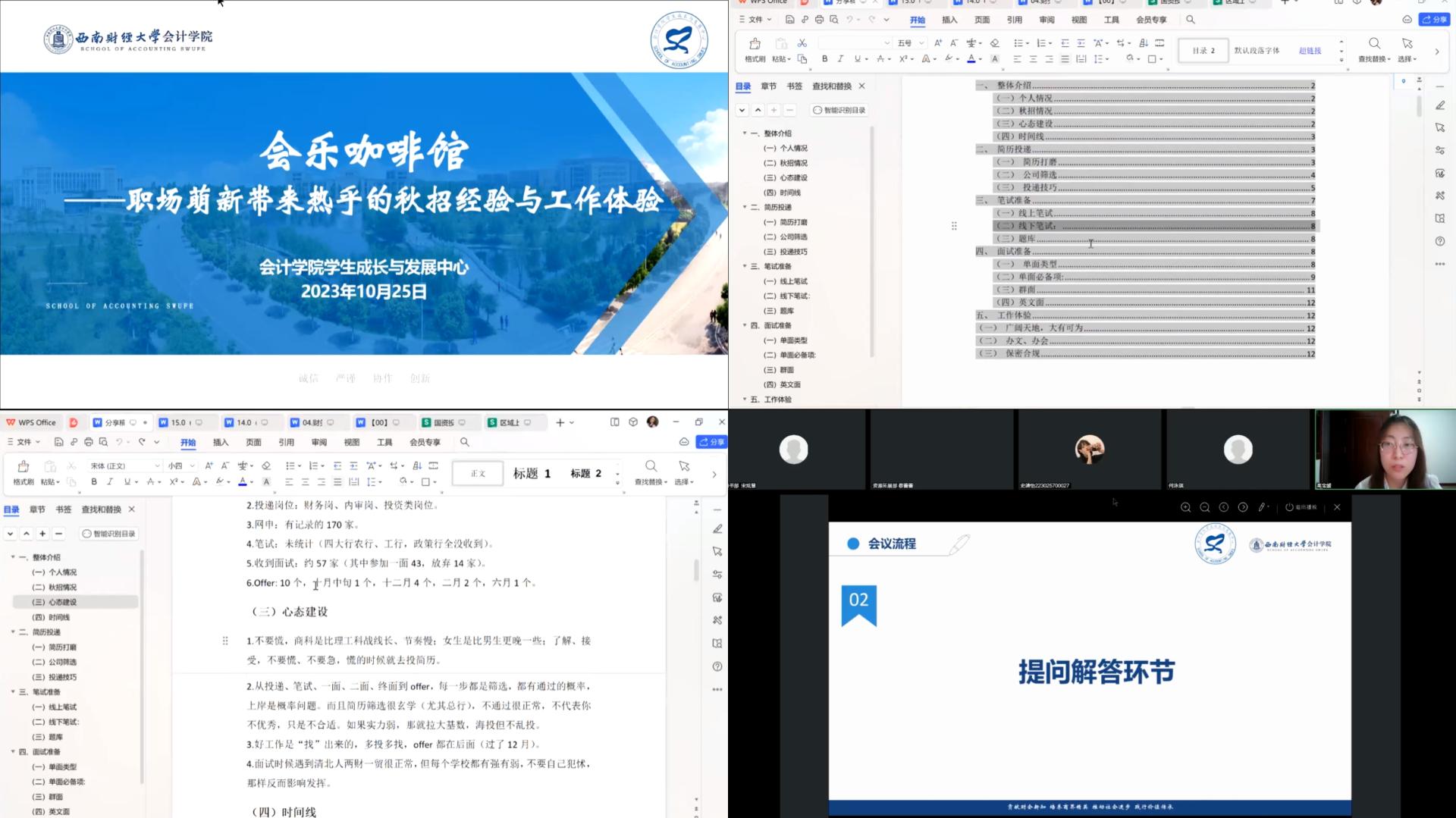 交流会中,高宝媛就个人背景和秋招投递情况进行了简要介绍,结合个人秋招经历为大家梳理了秋招时间线。高宝媛从简历投递、笔试准备、面试准备三方面介绍了自己的心得和经验。她认为在准备简历时应当依据岗位内容不断更新调整简历,突出技能导向;在投递时要注重技巧,多种渠道搜集招聘信息并通过定地域、定要求、定待遇等方式筛选企业,做好投递记录,提高投递效率。在笔试准备方面,高宝媛为大家举例介绍了不同企业的笔试内容和可参考的题库,提醒大家要提前准备,学会协调时间安排。在面试方面,高宝媛主要介绍了专业面、行为面、简历面等面试的主要类型和注意事项,着重分享了单面常见的问题及回答话术、群面的相关技巧及常见类型。在工作体验方面,高宝媛认为每一份工作都有自己的价值和意义,不要给自己施加压力,要保持不断学习的状态,多听多看;在泛体制内工作要多总结多汇报,及时与领导沟通。在提问答疑环节,同学们积极提问,高宝媛耐心地就同学们提出的关于轮岗、面试形式、企业待遇、实习等问题一一解答。