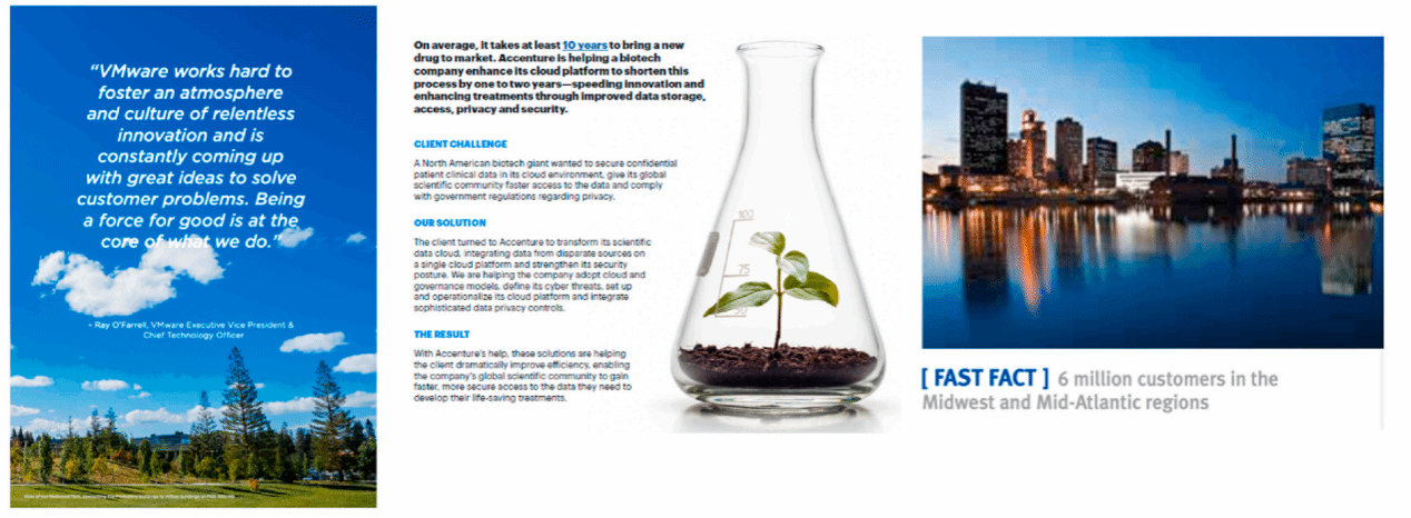 来源:VMWare Global Impact Report 2015; Accenture Corporate Citizenship Report 2017; FirstEnergy Sustainability Report 2012