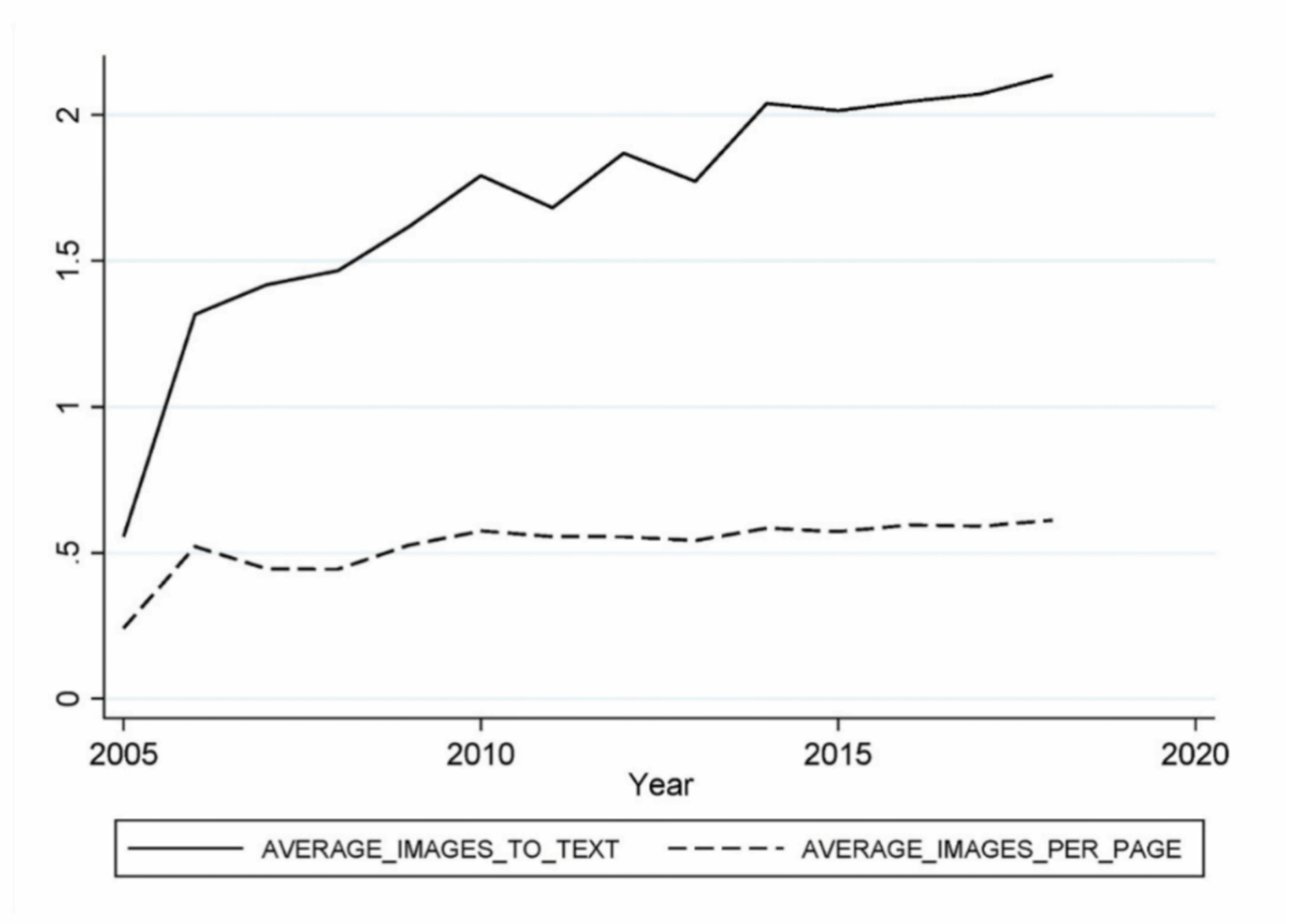 本研究首先构建了两项ESG报告层面的图片使用指标:一是图片数量与页数之比(“每页图片数”),二是图片数量与每1000词文本量之比(“图文比”)。从时间序列来看,在给定文本长度水平下,报告中的图片使用呈现出不断上升的趋势,如图1所示。图文比平均值表现出明显的上升趋势,进一步凸显了对ESG报告中图片使用进行研究的现实相关性和时效性。
