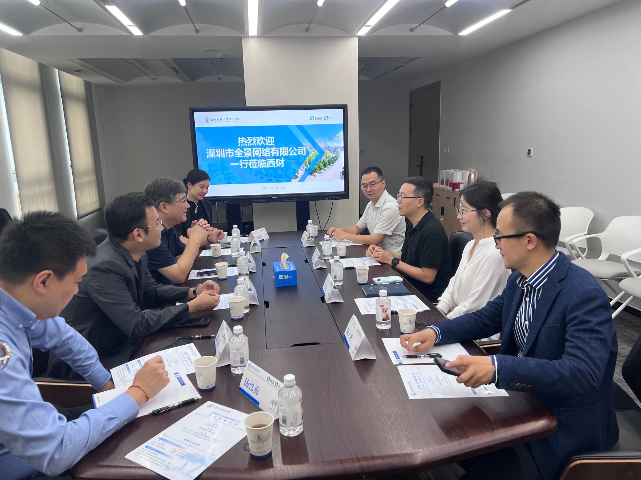 5月29日上午,深圳市全景网络有限公司总经理陈伟带队一行六人到访yl1111永利集团柳林校区,会计学院副院长易阳、专业学位教育中心副主任许楠、大数据会计教学与研究中心副主任郝金星、校友与国内合作办公室主任徐天然一同接待并洽谈合作。