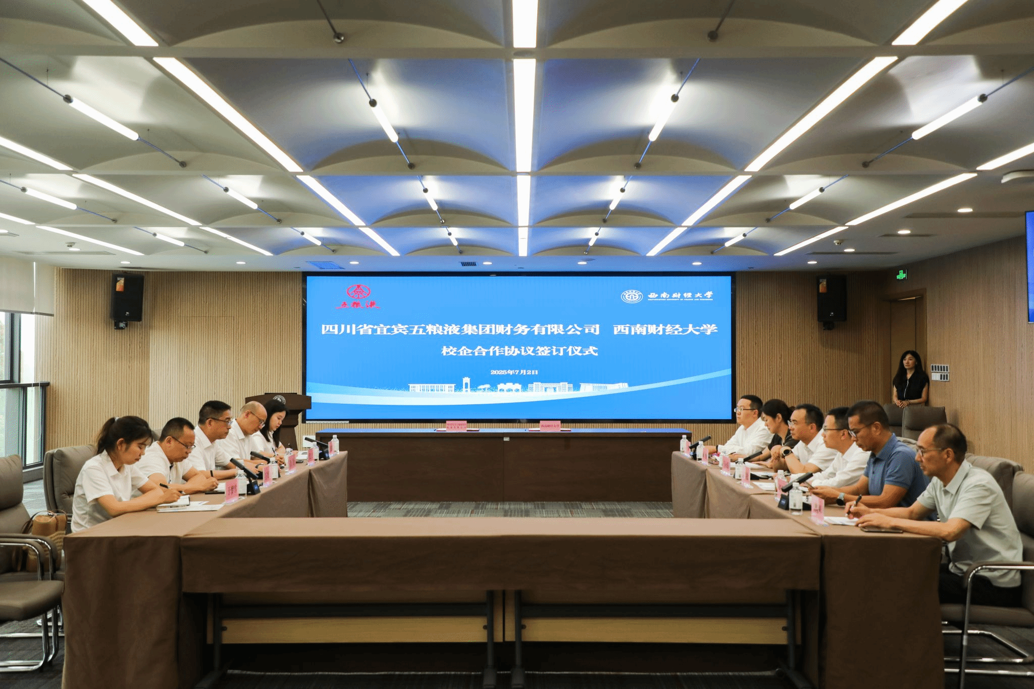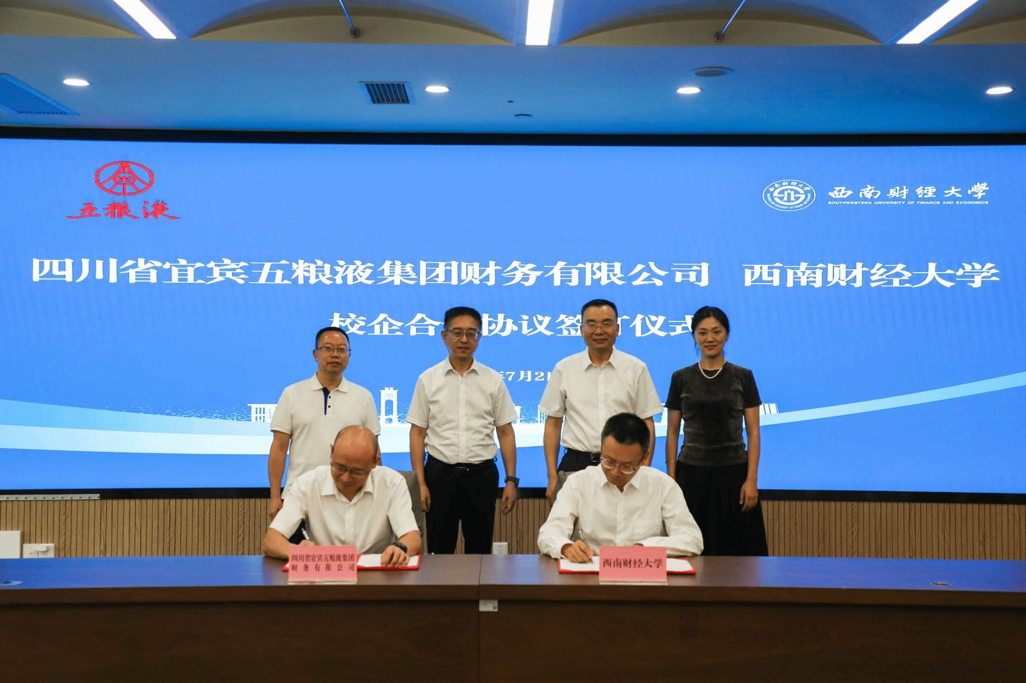 On July 2, the signing ceremony for the school-enterprise cooperation between the Southwestern University of Finance and Economics (SWUFE) and Sichuan Yibin Wuliangye Group Finance Co., Ltd. (hereinafter referred to as “the Company”) was held at the Liulin Campus of SWUFE. Zhang Xin, a Member of the CPC Committee, Deputy General Manager, Financial Director, and Secretary of the Board of Directors of the Company; Dai Ning, Secretary of CPC Branch and Chairman of the Company; and Ma Yongqiang, a Member of the Standing Committee of the CPC Committee and Vice President of SWUFE, attended the ceremony.