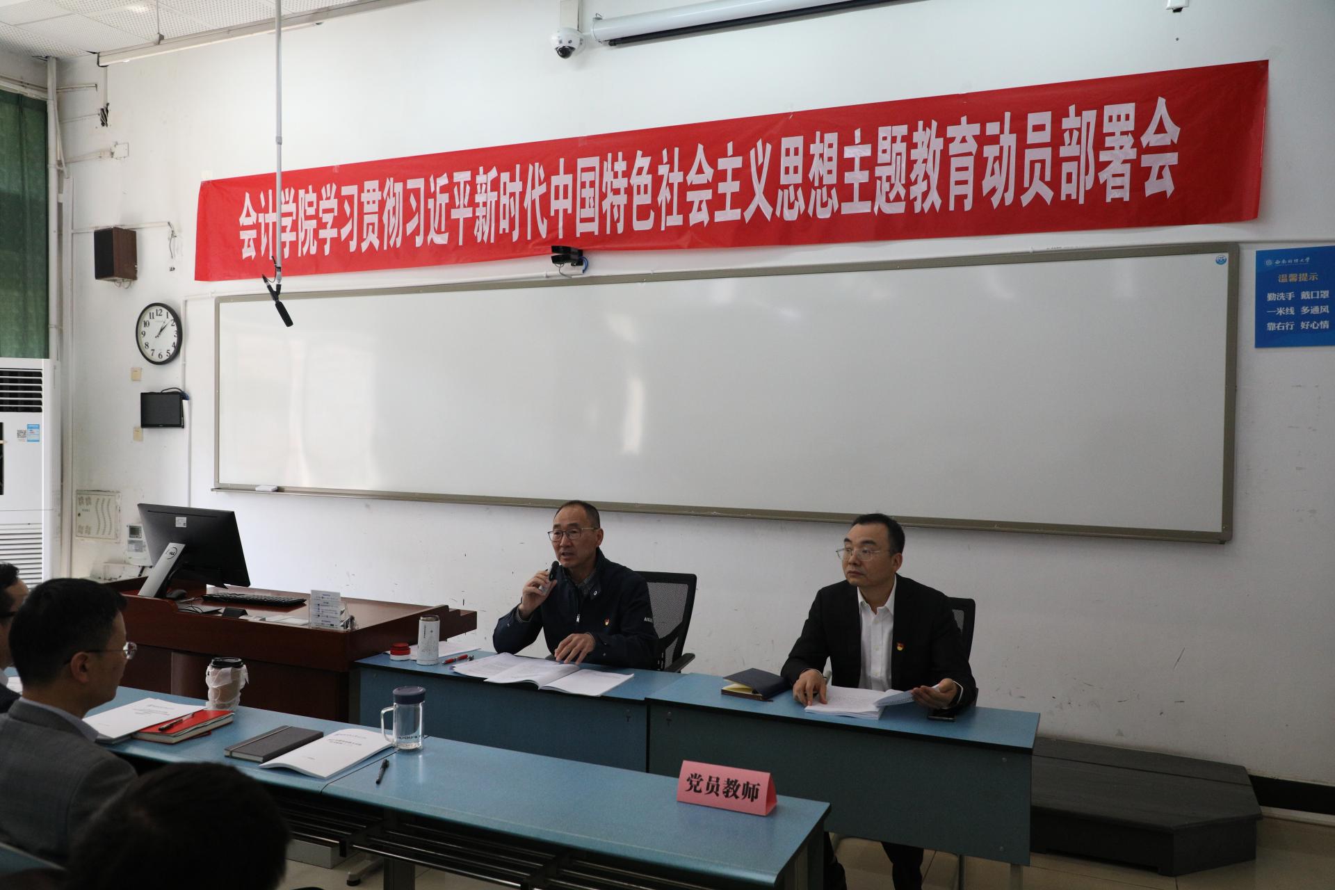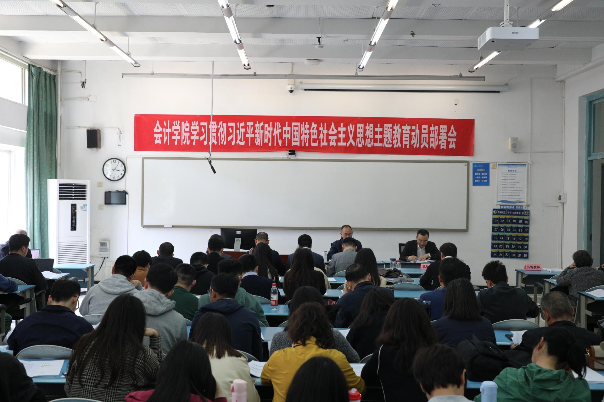 为全面贯彻落实习近平总书记在学习贯彻习近平新时代中国特色社会主义思想主题教育工作会议上的重要讲话精神,按照上级及学校党委安排部署,4月25日下午13:00,会计学院在颐德楼H312教室组织召开学习贯彻习近平新时代中国特色社会主义思想主题教育动员部署会,学院全体党员教师、学生党员代表和教职工参加会议。会议由院长马永强主持。