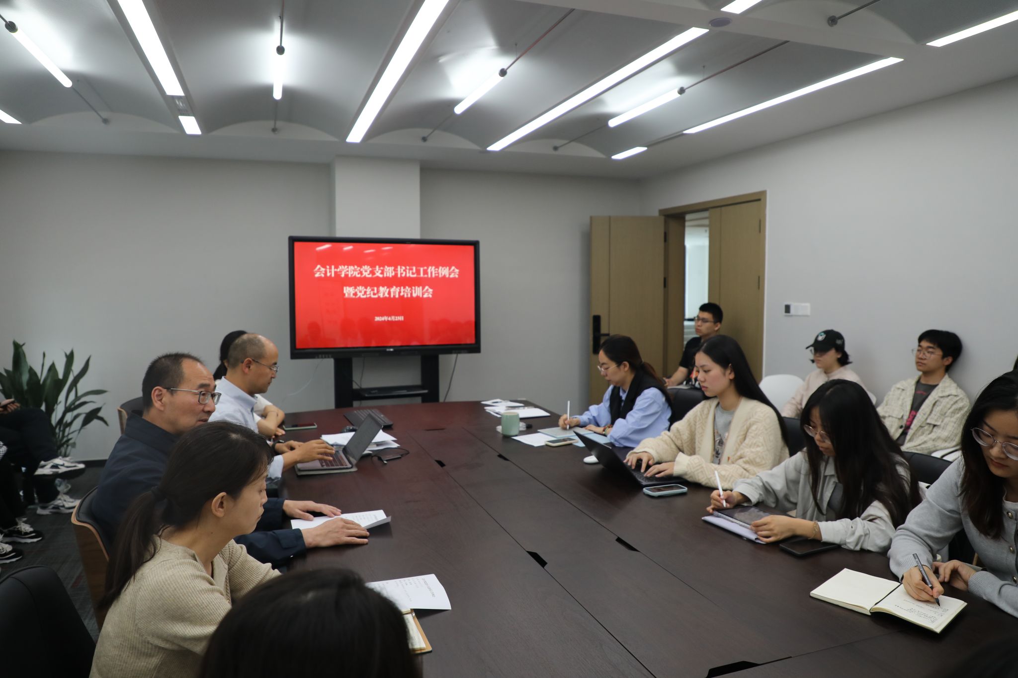 4月23日下午14:00,会计学院党支部书记工作例会暨党纪教育培训会在诚正楼731会议室开展。本次会议由学院党委副书记张太富主持,党委书记刘晓彬、党委副书记杨长虹、教工第二党支部书记宋晋出席会议,学生党建工作站秘书处及全体支部委员参加。